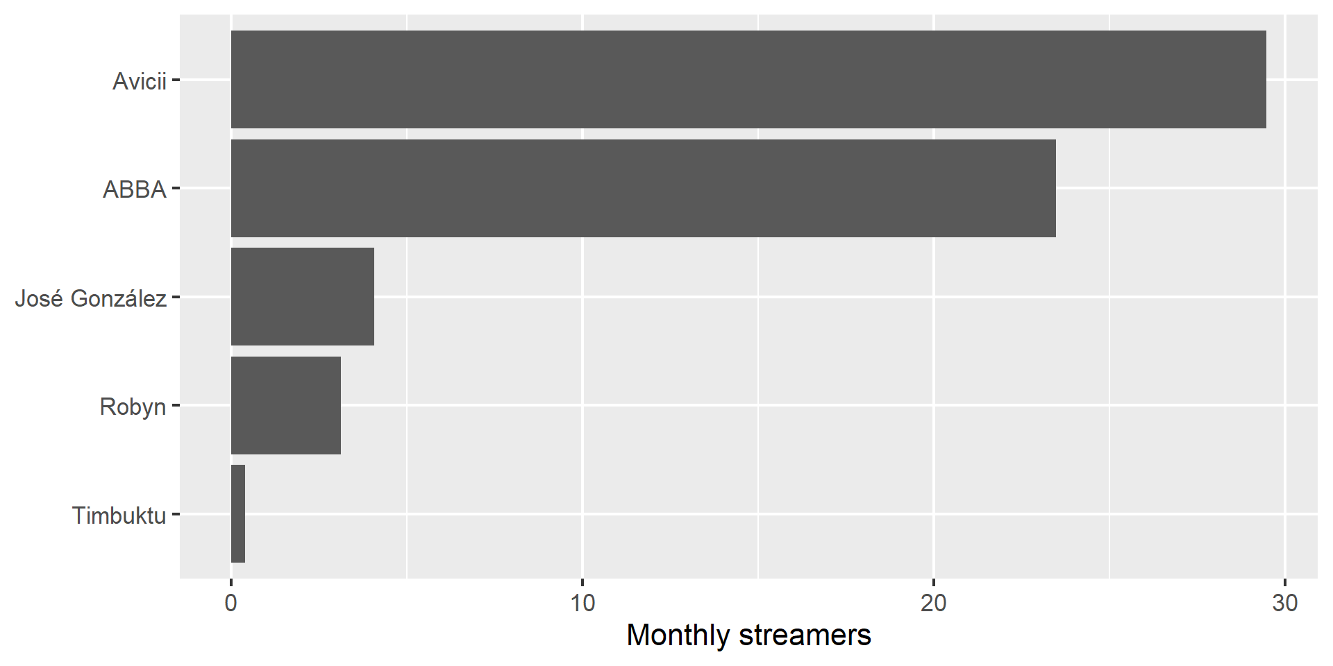 ggplot(artists, aes(monthly_streamers, fct_reorder(artist, monthly_streamers))) + geom_col() + scale_x_continuous( name = "Monthly streamers" ) + scale_y_discrete( name = NULL # no axis title )