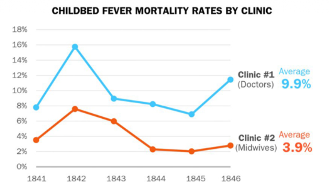 Semmelweis decided to investigate. At this hopital there was a clinic for training doctors and another for midwives. He noticed a pattern. At this time germs or infections were not known so people thought the issue could be bad air ‘miasma’, overcrowding, cold temperature or delivery methods.