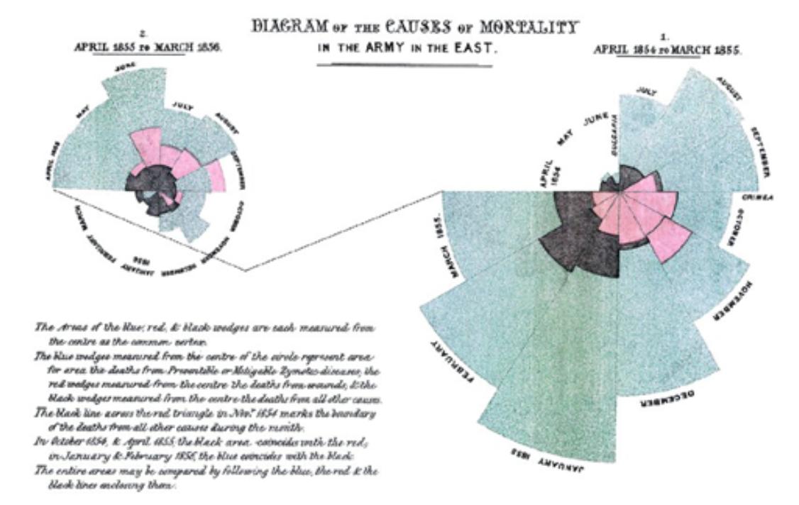 Nightingale fought resistance from male doctors to improve “cleanliness, sanitation, ventilation nutrition, and” other factors. This dropped mortality rates from 42% to 2%!