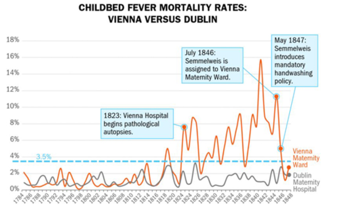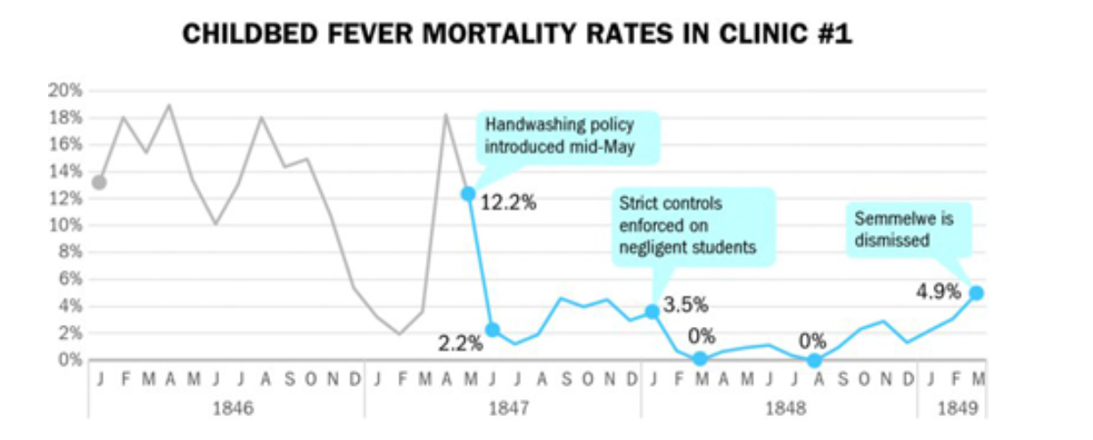 He experimented with a hand washing policy that dramatically reduced the mortality rate, including some months of 0 deaths!