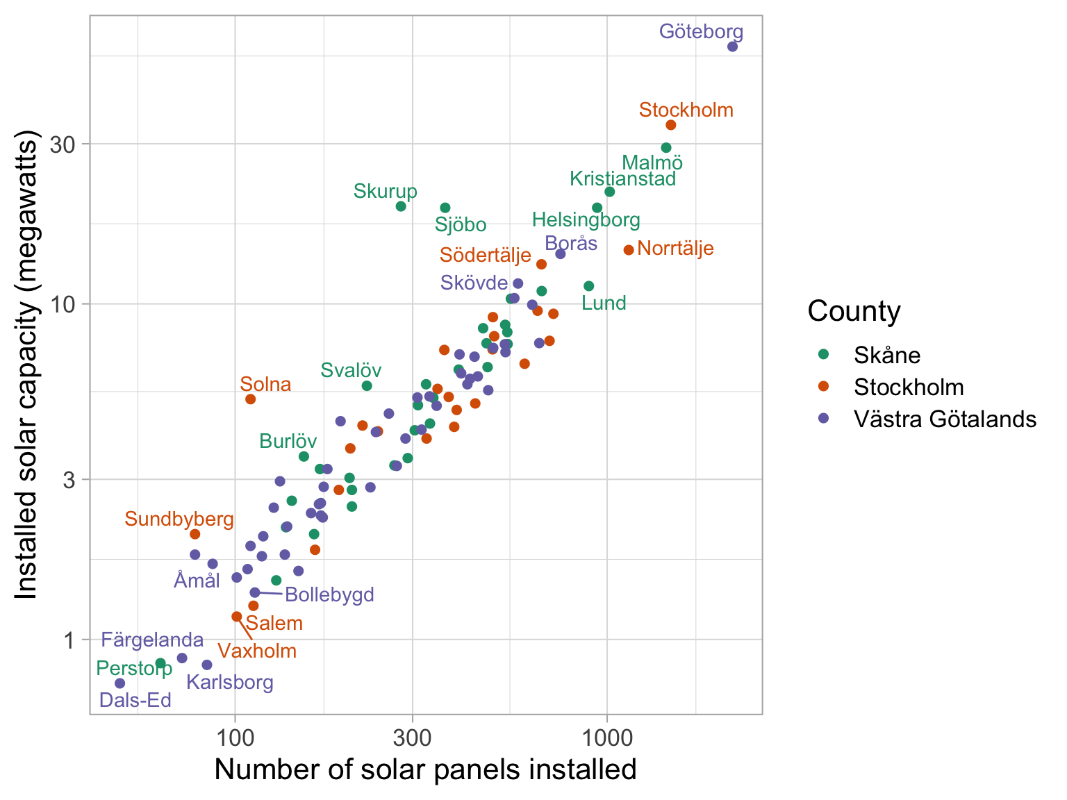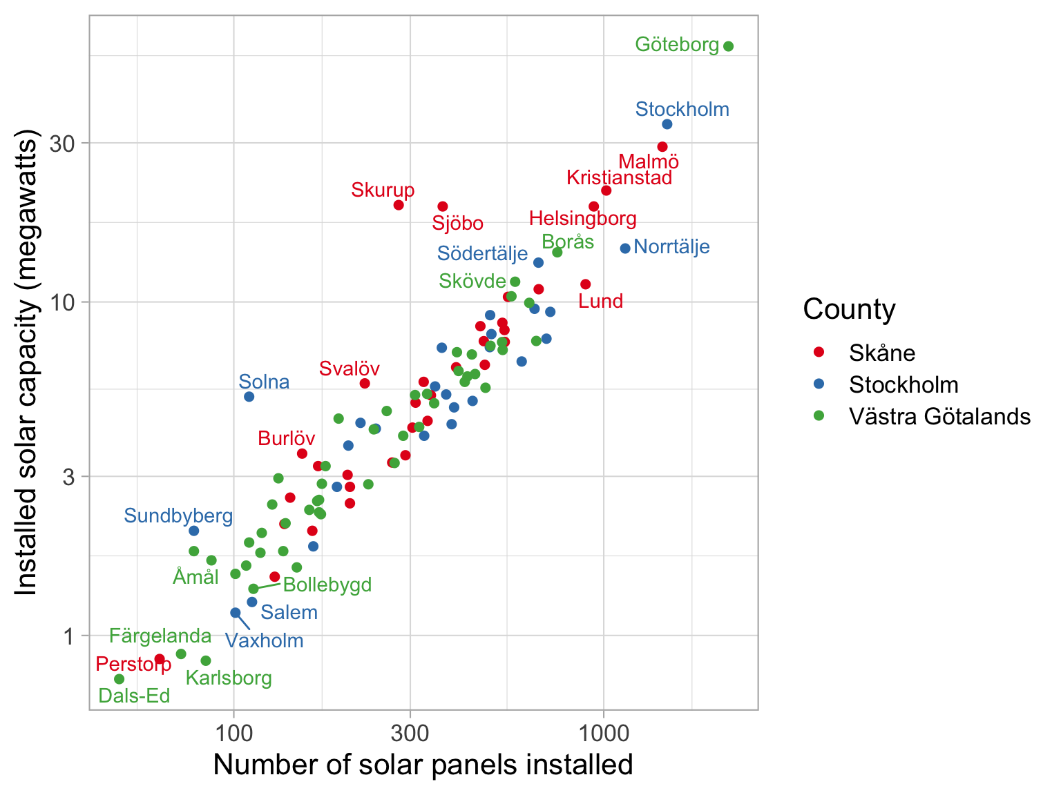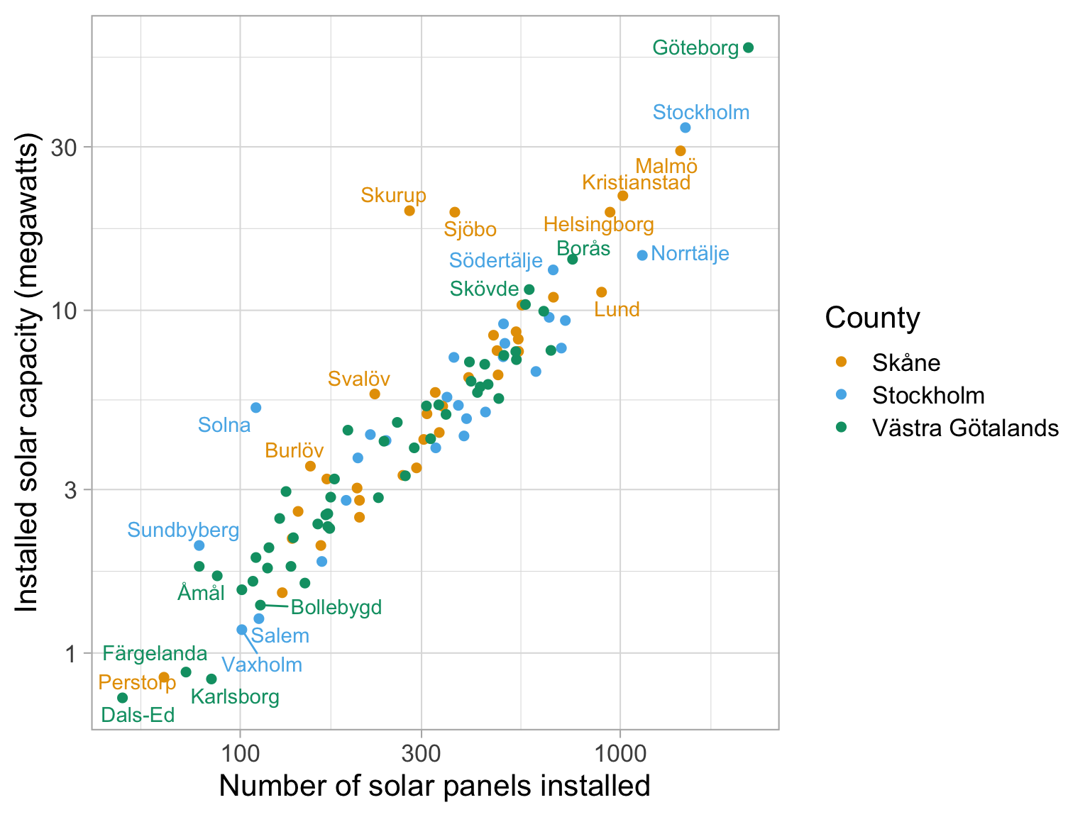 In this case we have a log scale on the y-axis because the data is quite skewed, and we want to be able to see the differences between the points more clearly. So Stockholm city has almost 10X the median installed solar capacity in the county.