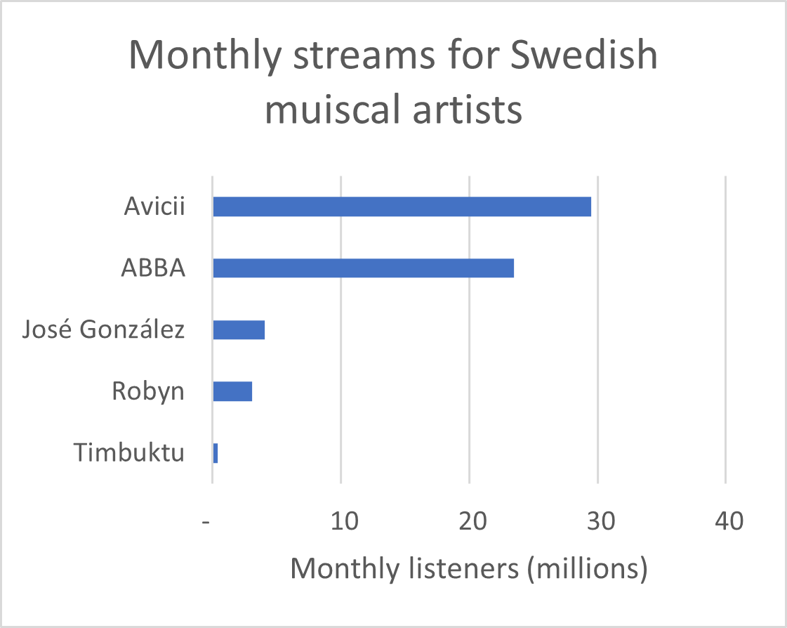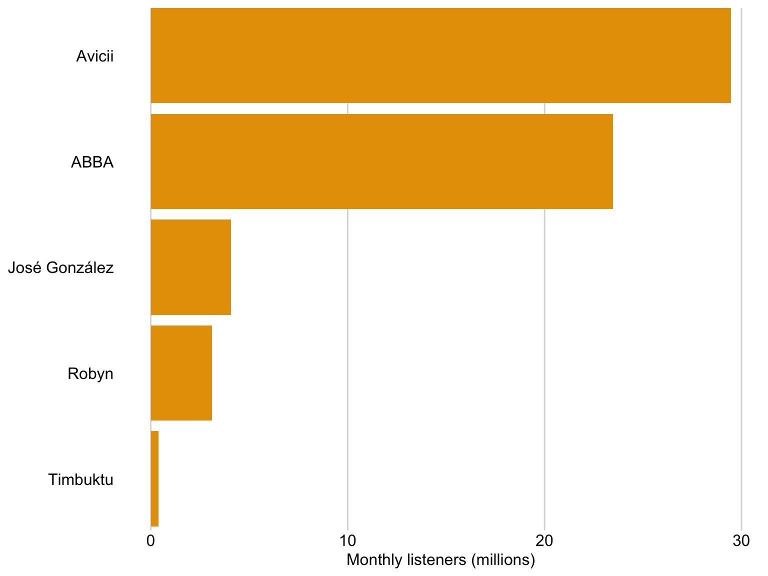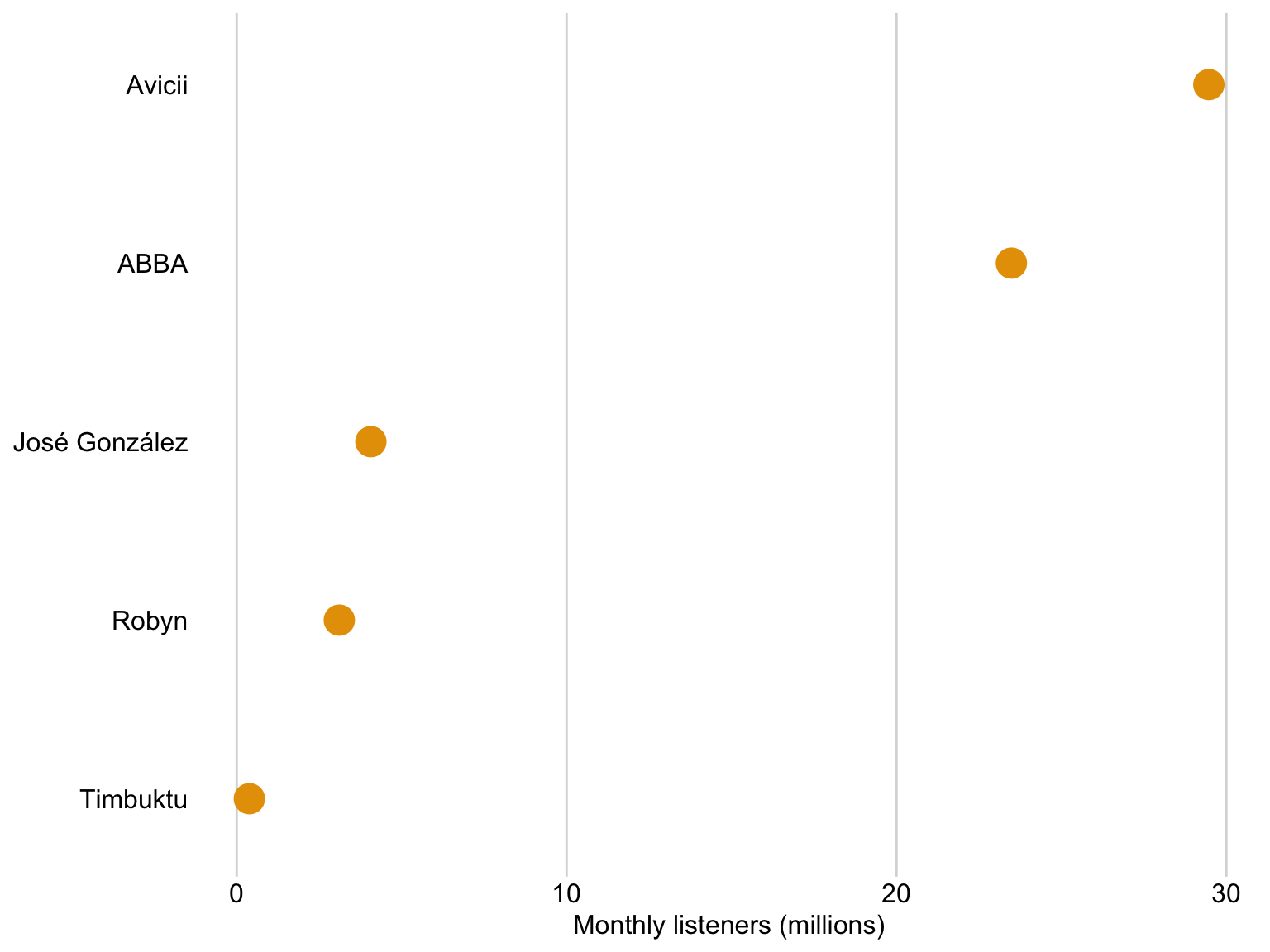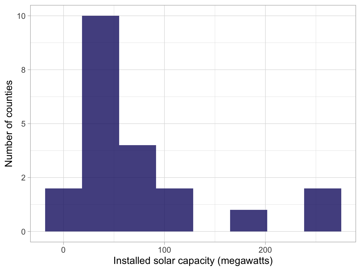 In this case we have a log scale on the y-axis because the data is quite skewed, and we want to be able to see the differences between the points more clearly. So Stockholm city has almost 10X the median installed solar capacity in the county.
