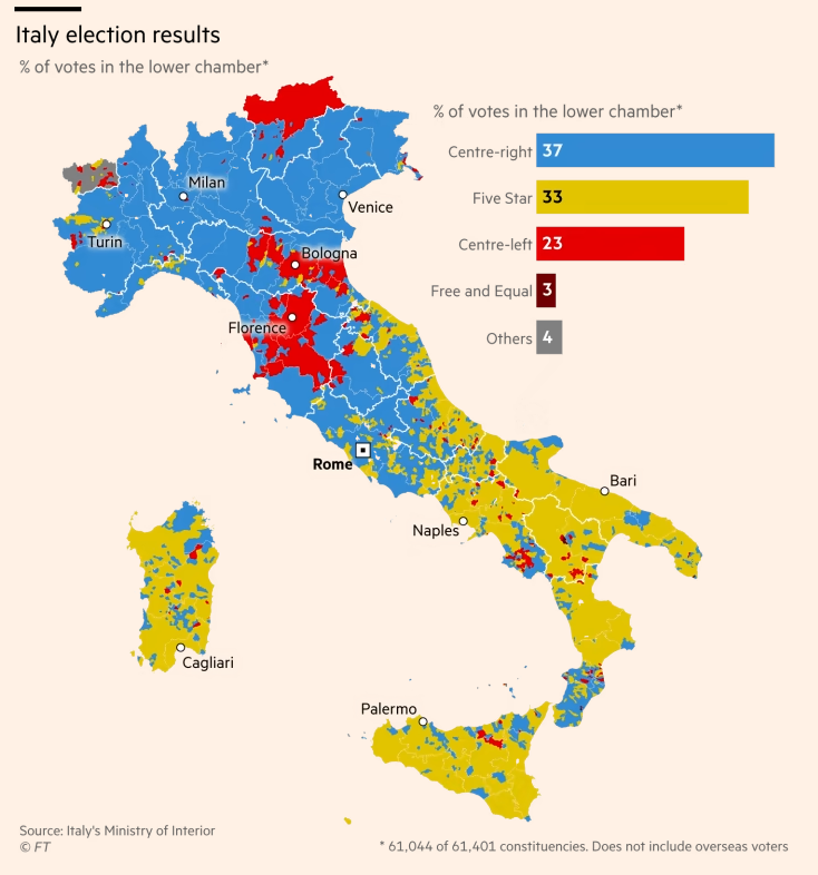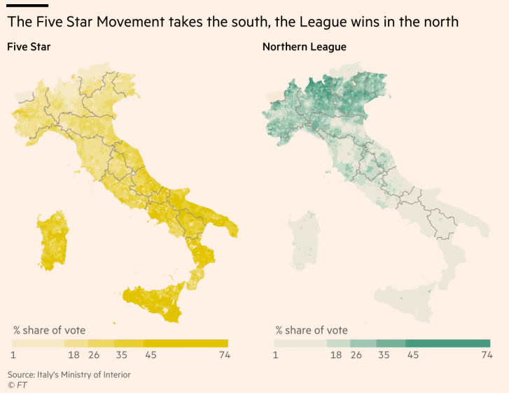 Another thing I should mention is that they have been quite clever with the legend - you can see here the breaks are in specific places, in oder to best show that the Norhtern League’s support is really concentrated in the North, and the Five Star Movement’s support is really concentrated in the South and Sicily.
