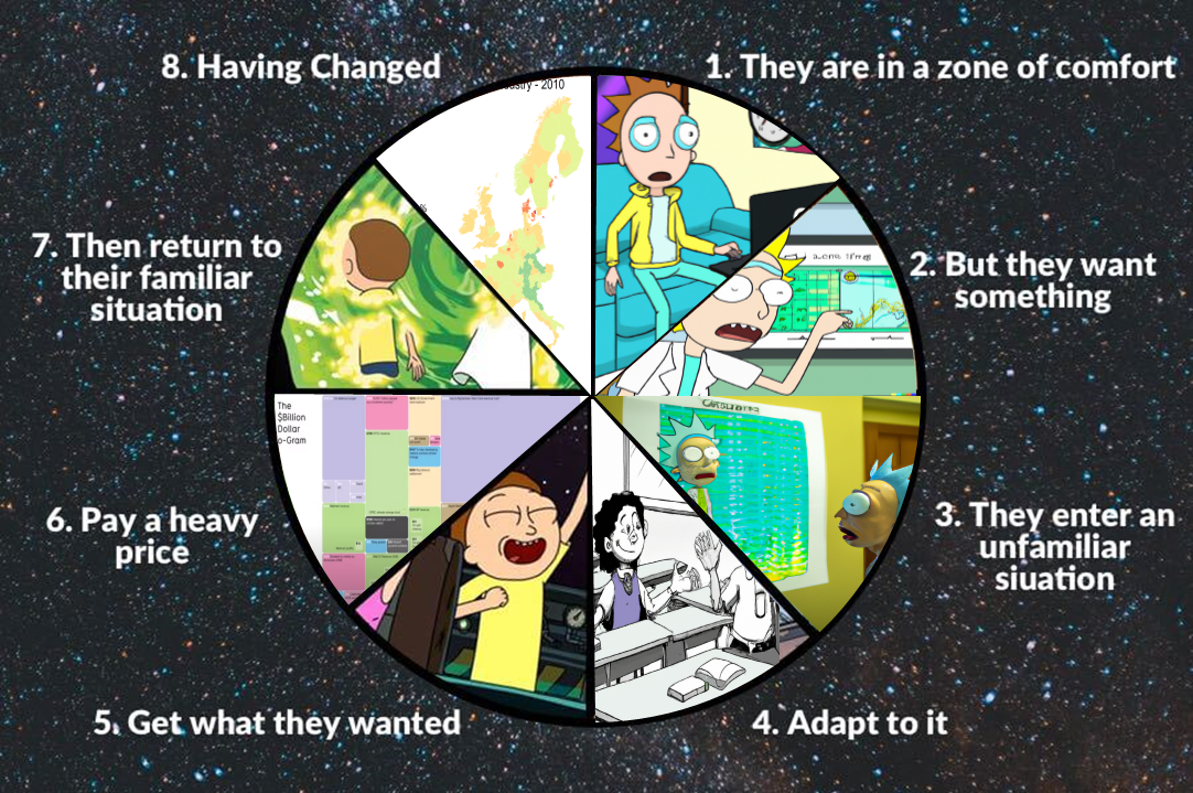 Great! So Dan Harmon has this idea of the story circle. It is a way to structure a story, demonstrated here with an eight part pie chart showing an example of a Rick and Morty episode.