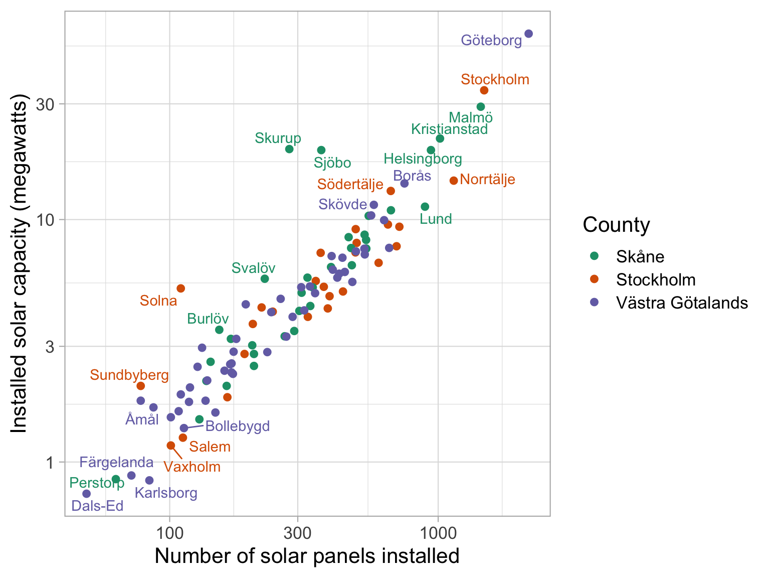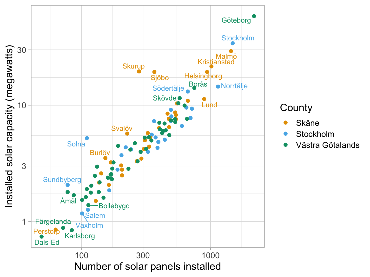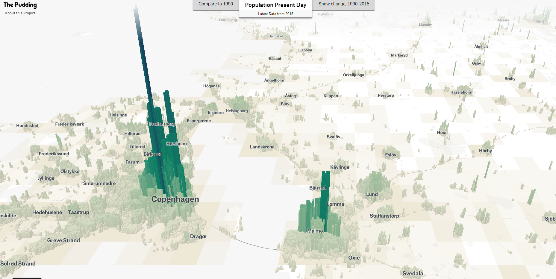 Here i have a screenshow of the map showing the Oresund region, and we can see how centered the population is in Copenagenhagen and Malmo, and how the population density drops off as we move away from the cities to smaller towns.