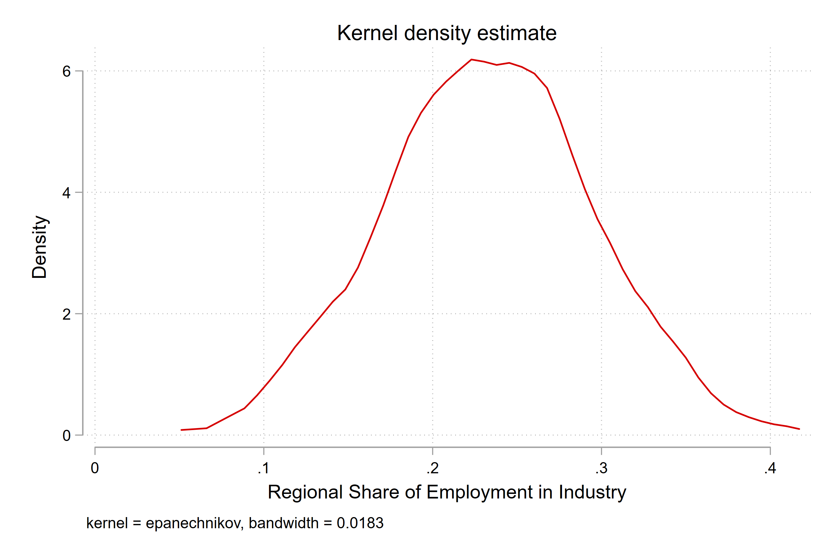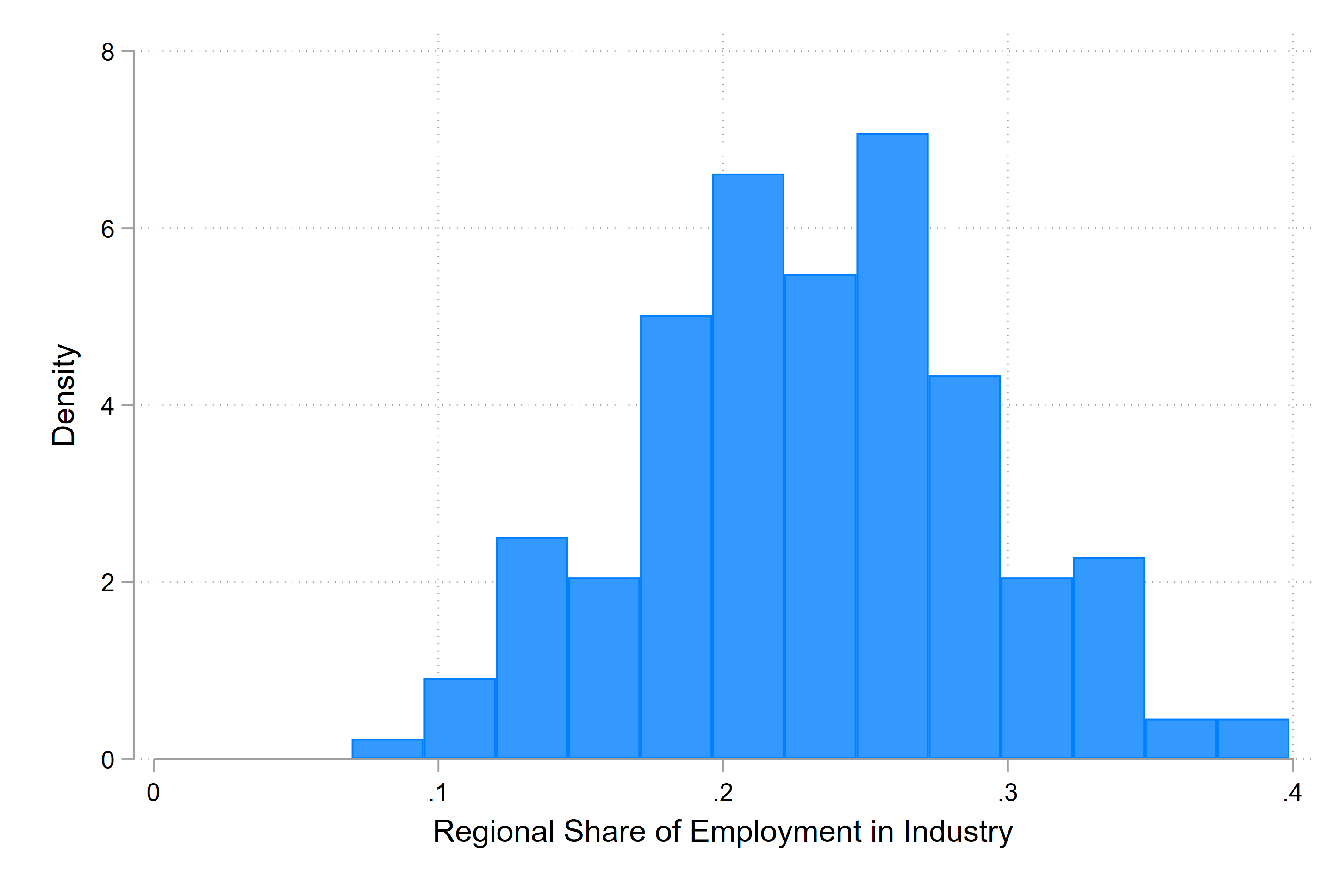 So in Stata we can make a histogram of our data with the hisogram command. This allows us to see the distribution of the data - for each region in the dataset, we look what the value is of regional share of employment in industry, and we count that value and add it to the bin.