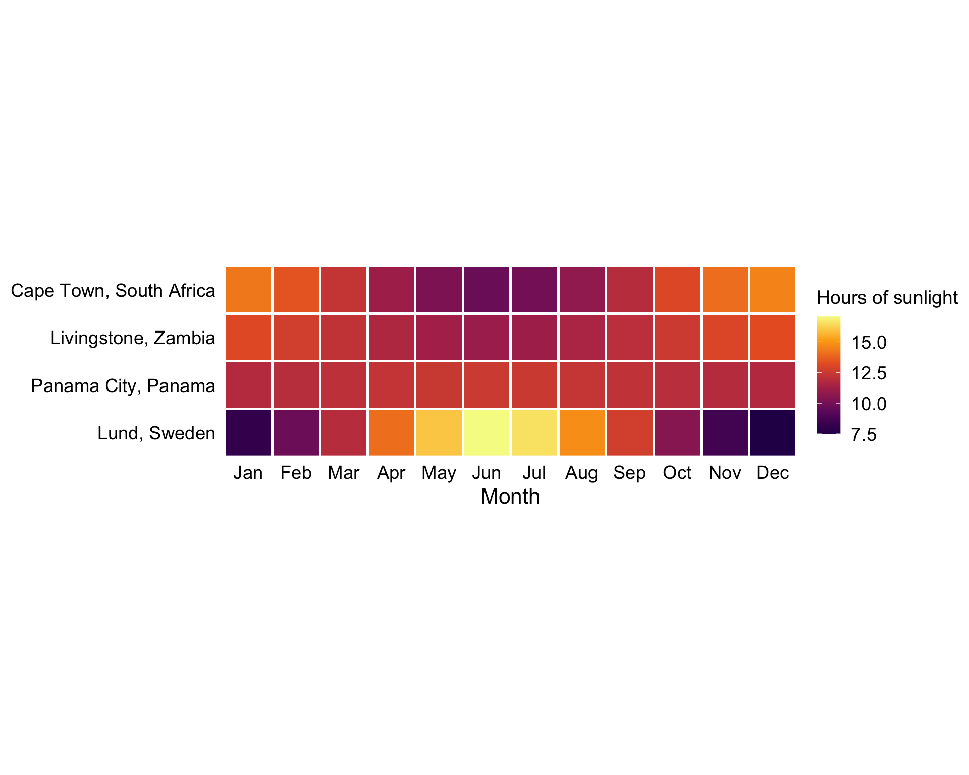 Here we are looking at the number of hours of sunlight in different cities around the world.