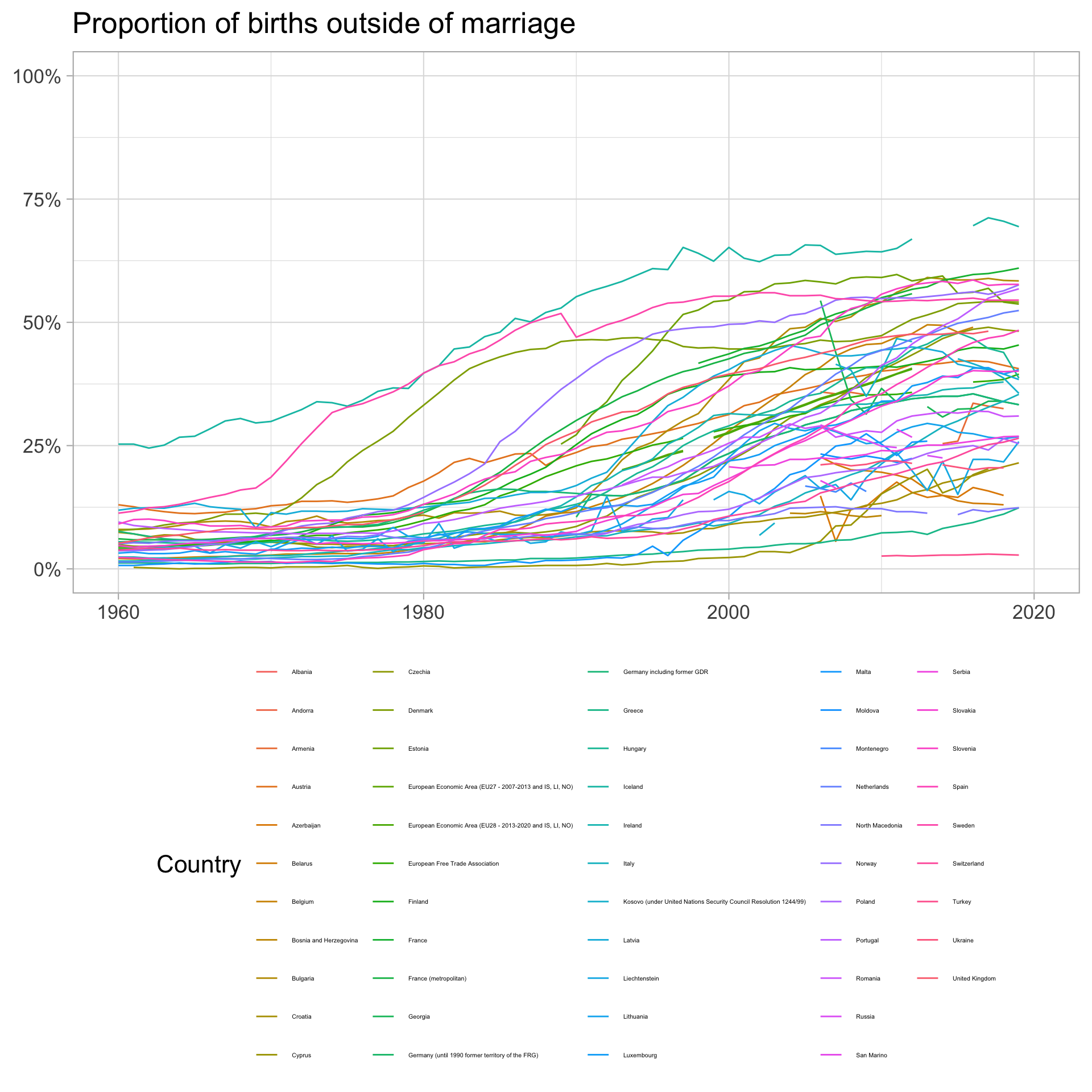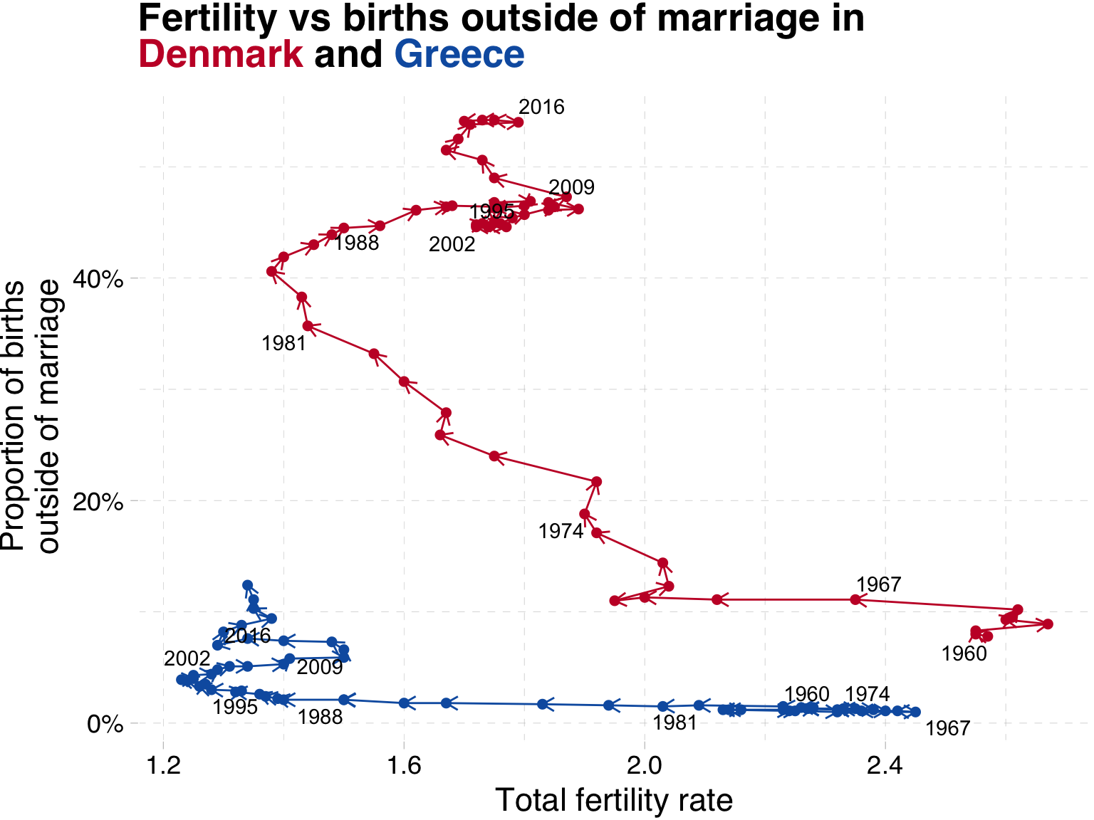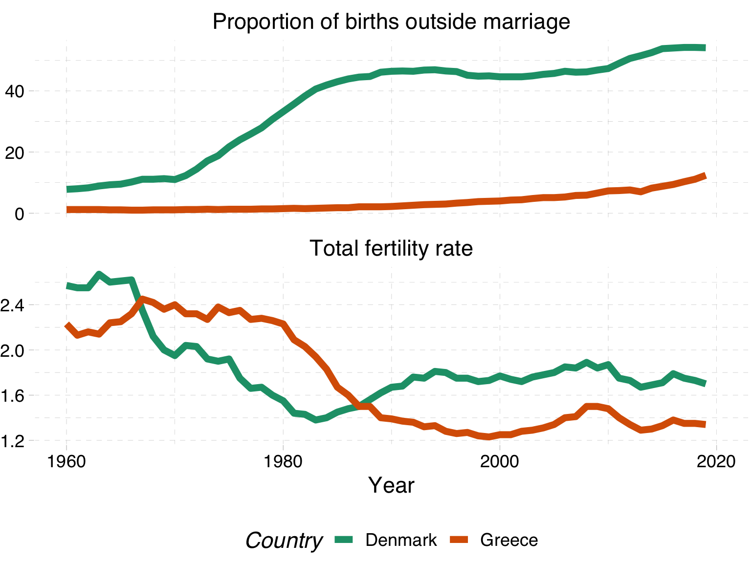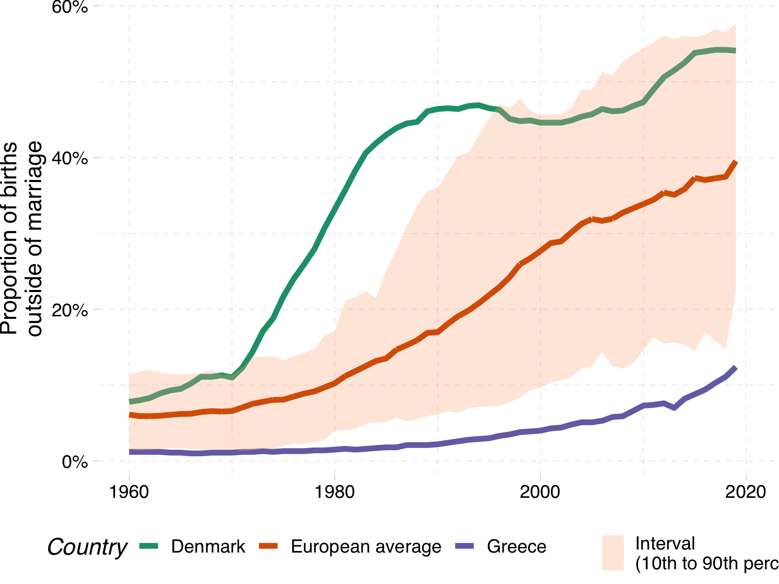 We can see that in Denmark, the share of children born outside of marriage was higher than Greece in 1960, and then really increased in 1970 to about 1990, before levelling off somewhat at about 50% of children born outside of marriage.