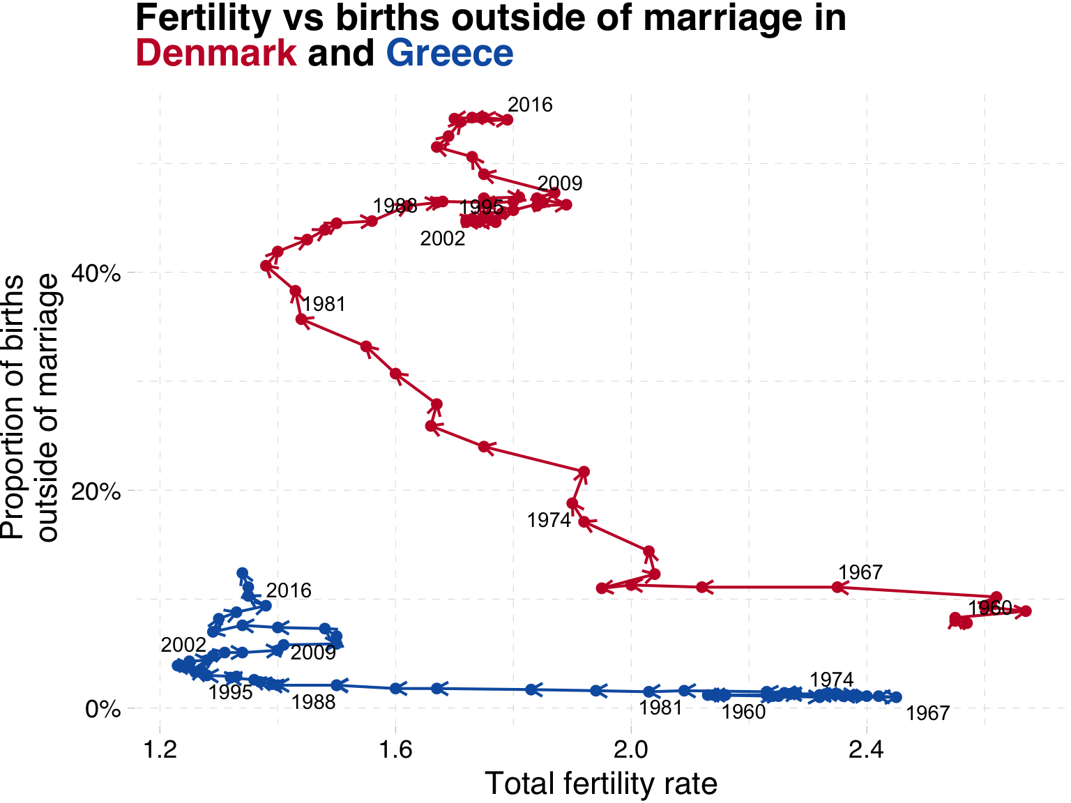 After 1990, Danish fertility increased from 1.3 to 1.8, while Greek fertility remained at ‘lowest-low’ levels, below replacement.