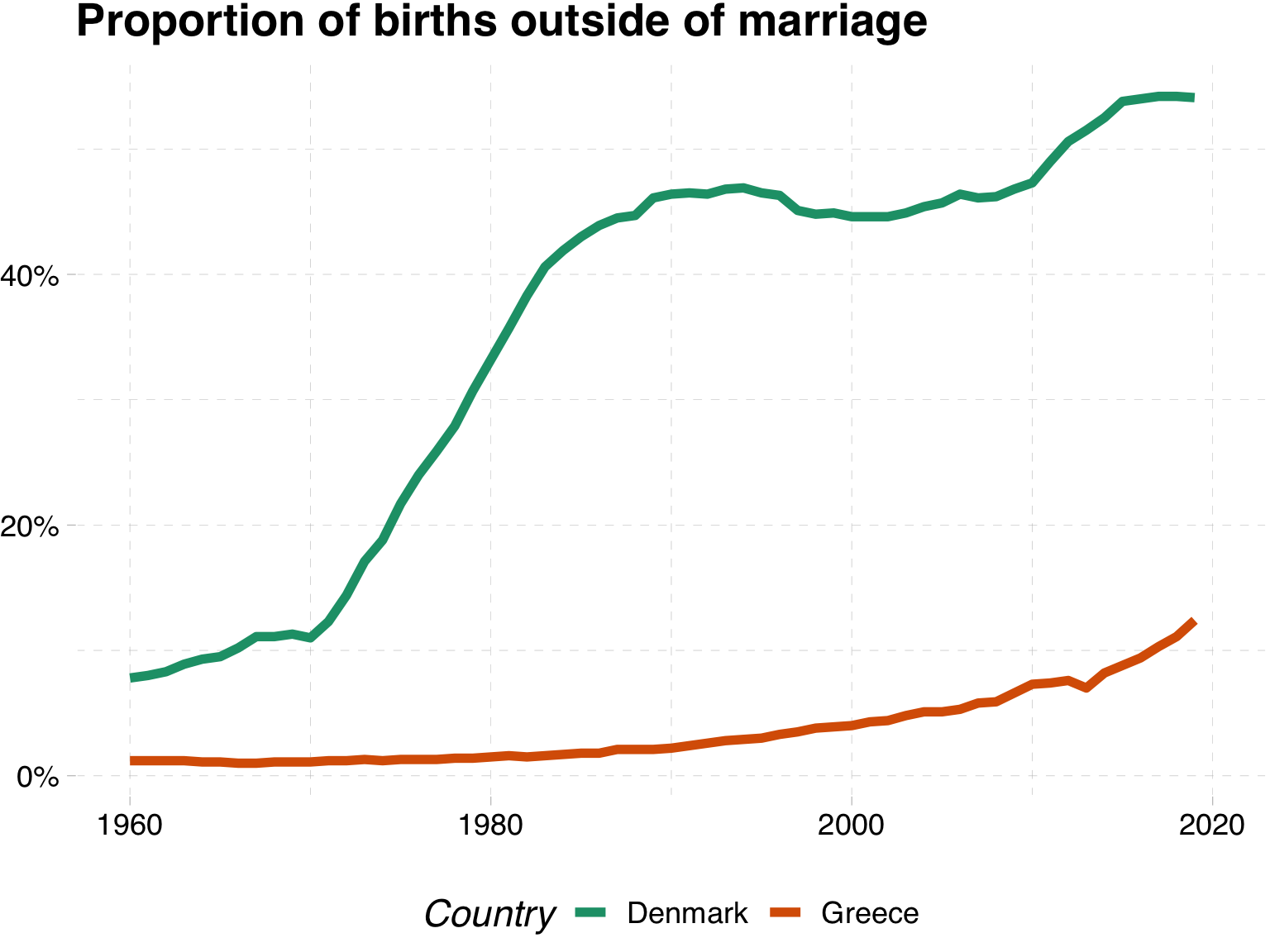 In Denmark, after 1970 we see an increase in the share of children born outside of marriage