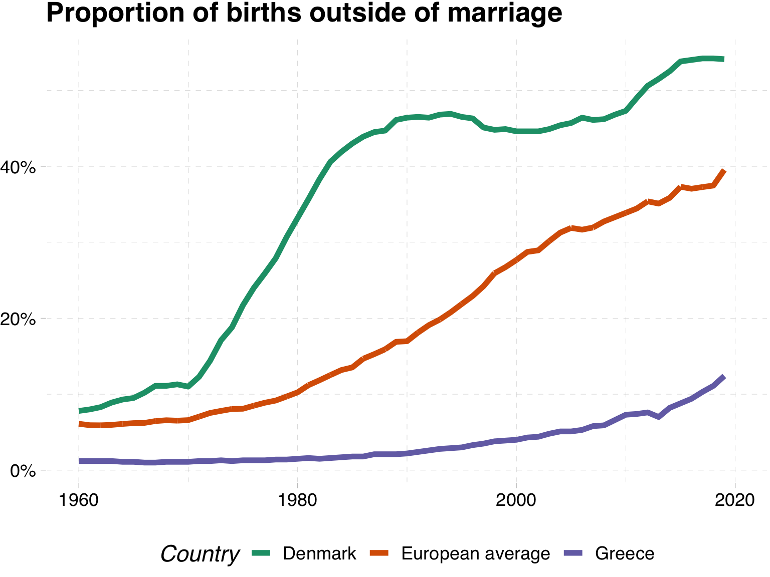 Do Denmark and Greece represent the extremes of the share of children born outside of marriage in Europe?