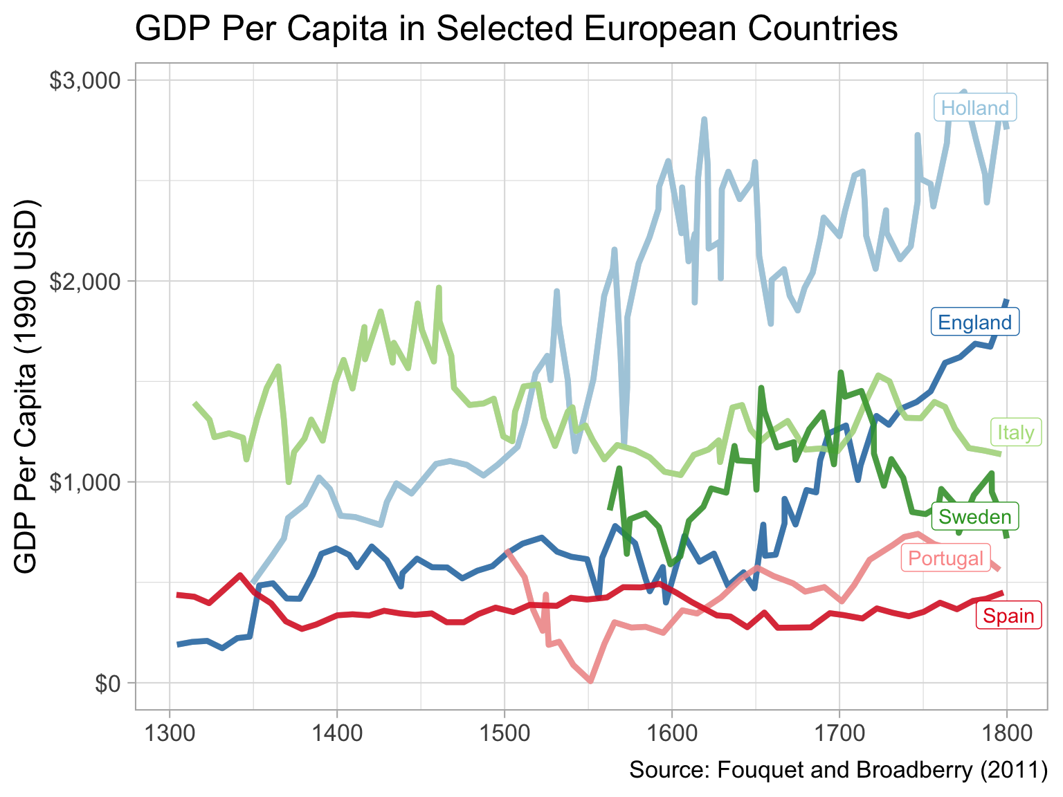 I did another neat thing here, where I used the markdown in the title to colour the country names in the legend to match the colours of the lines. This way we don’t need to have a legend and a title, and we can save some space on the plot. I also used the colours from the flags of the countries, which is a nice touch, if I do say so myself.