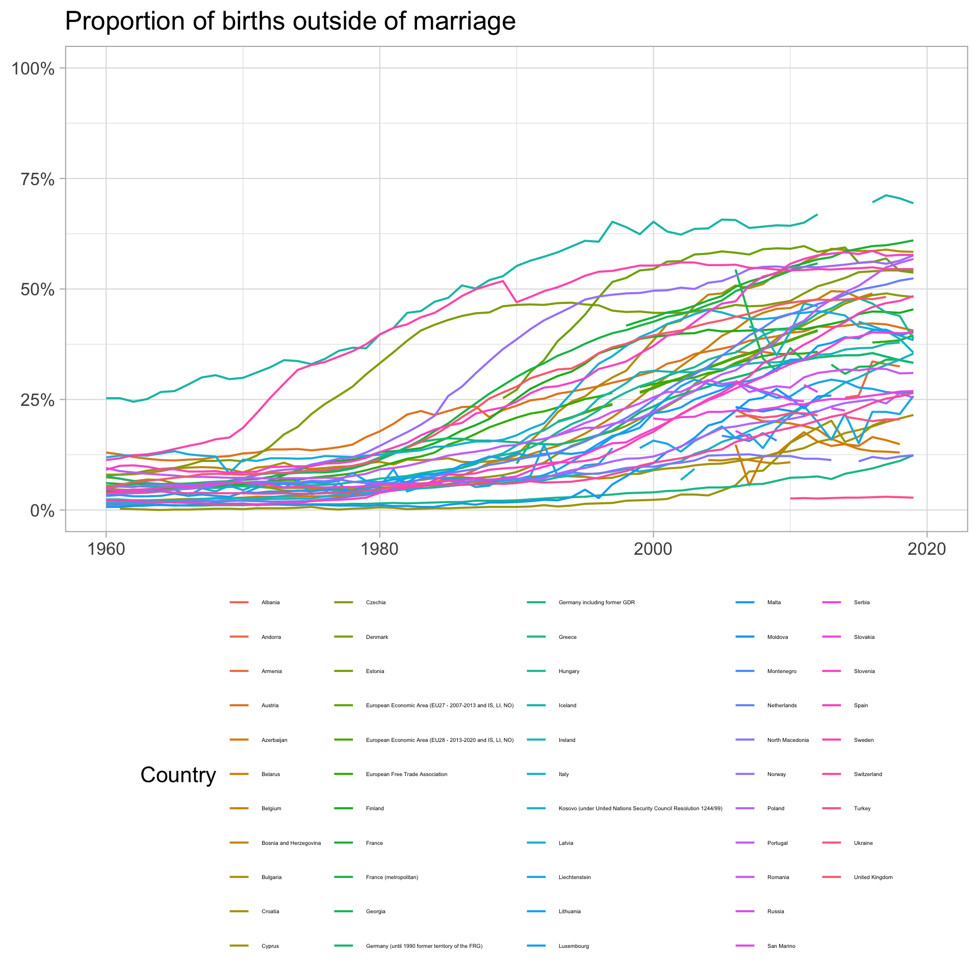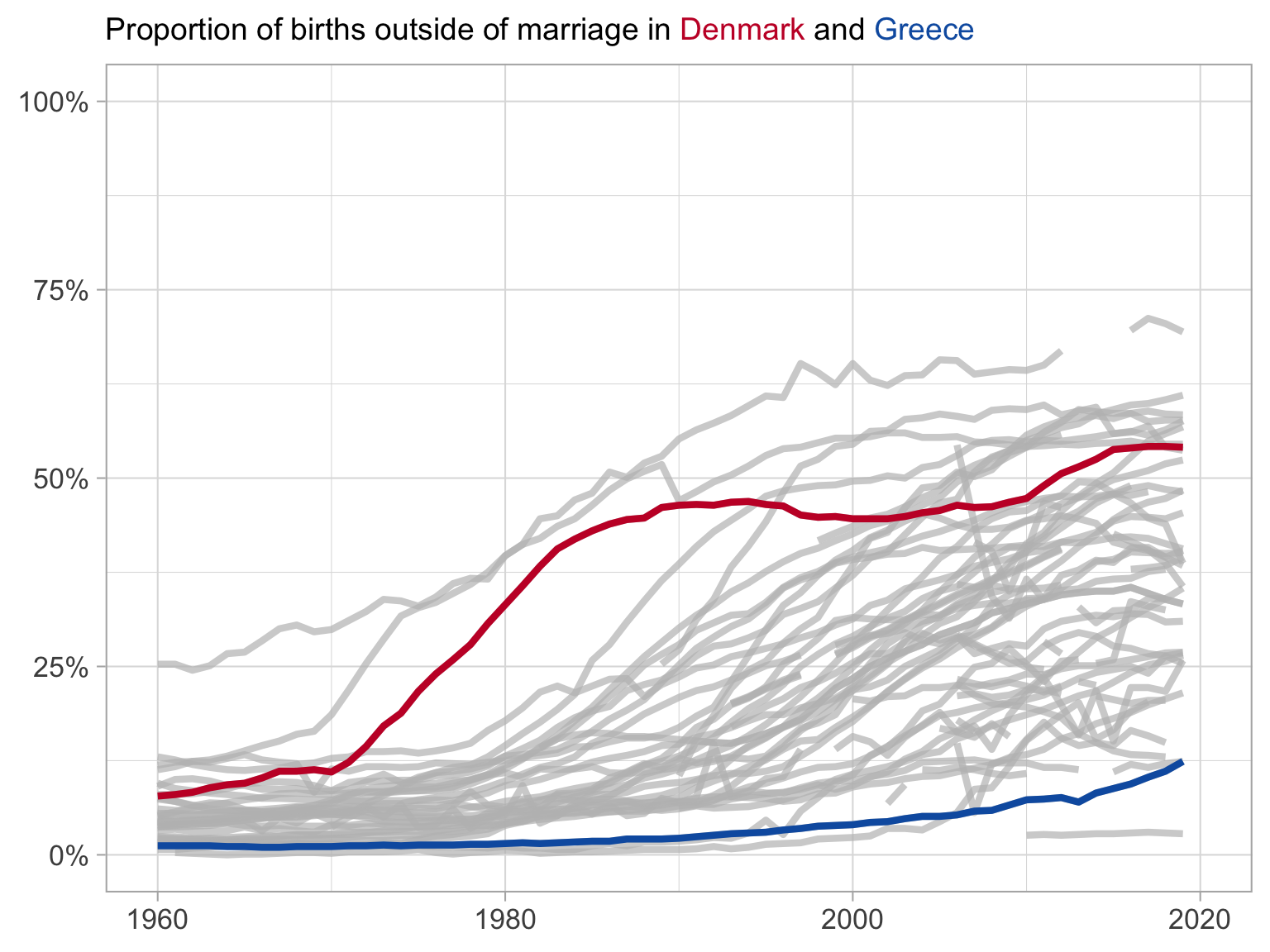 For instance, in our line graph above which showed the evolution of the share of births outside of marriage in Denmark and Greece , we might want to know if these two represent the extremes within Europe.